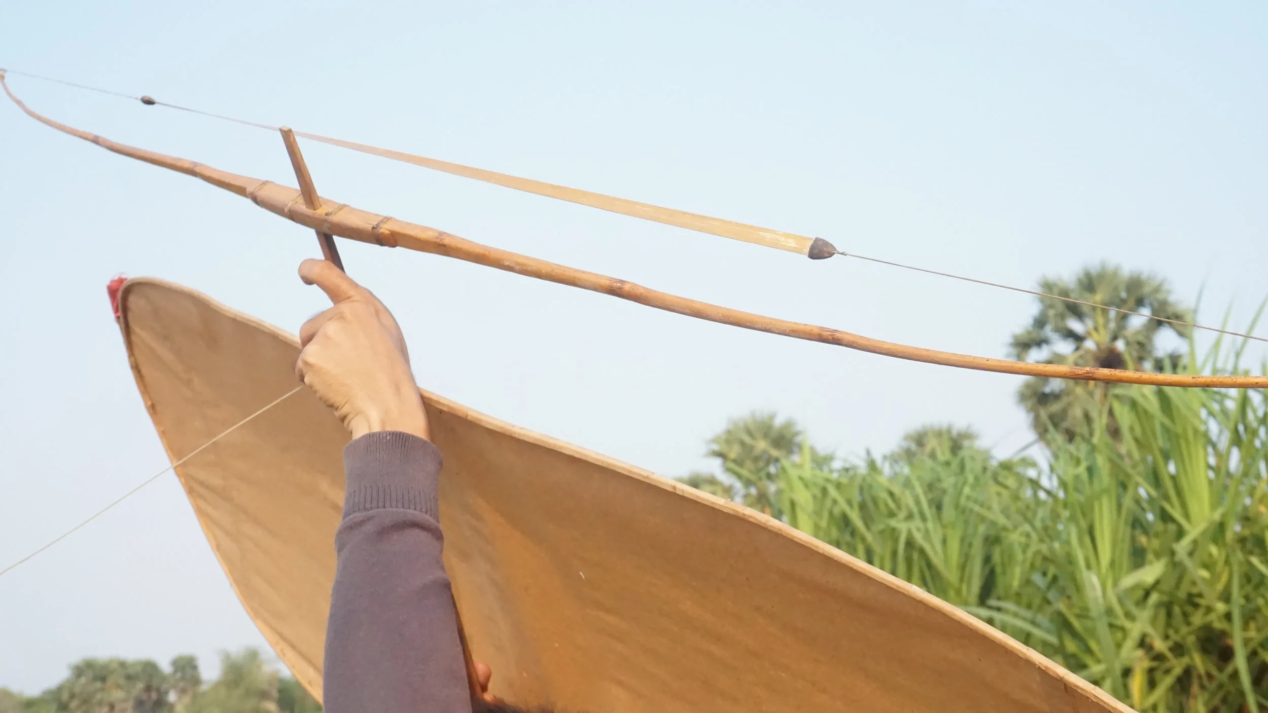The Aek is a curved, bow-shaped extension attached to the nose of the kite. Strung tightly across it is a durable string — traditionally made from the tendon of a stork or adjutant bird. As the wind passes through, the tension creates a deep, continuous humming sound.